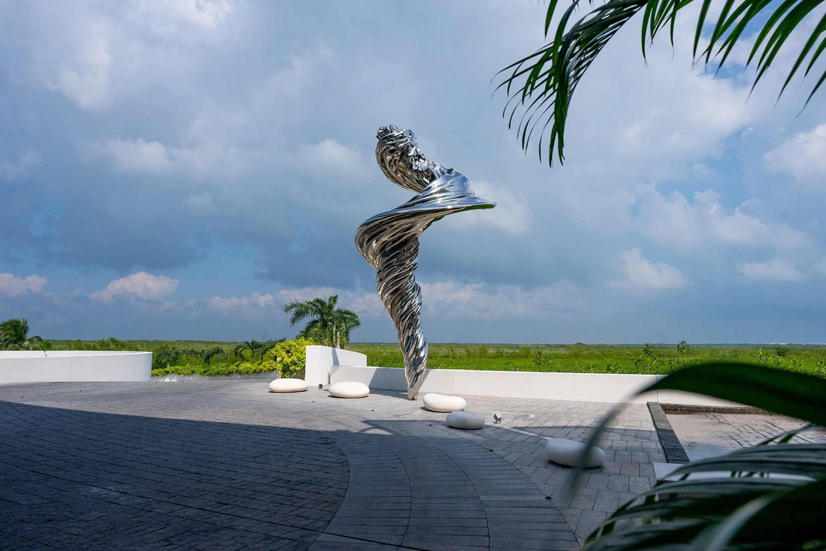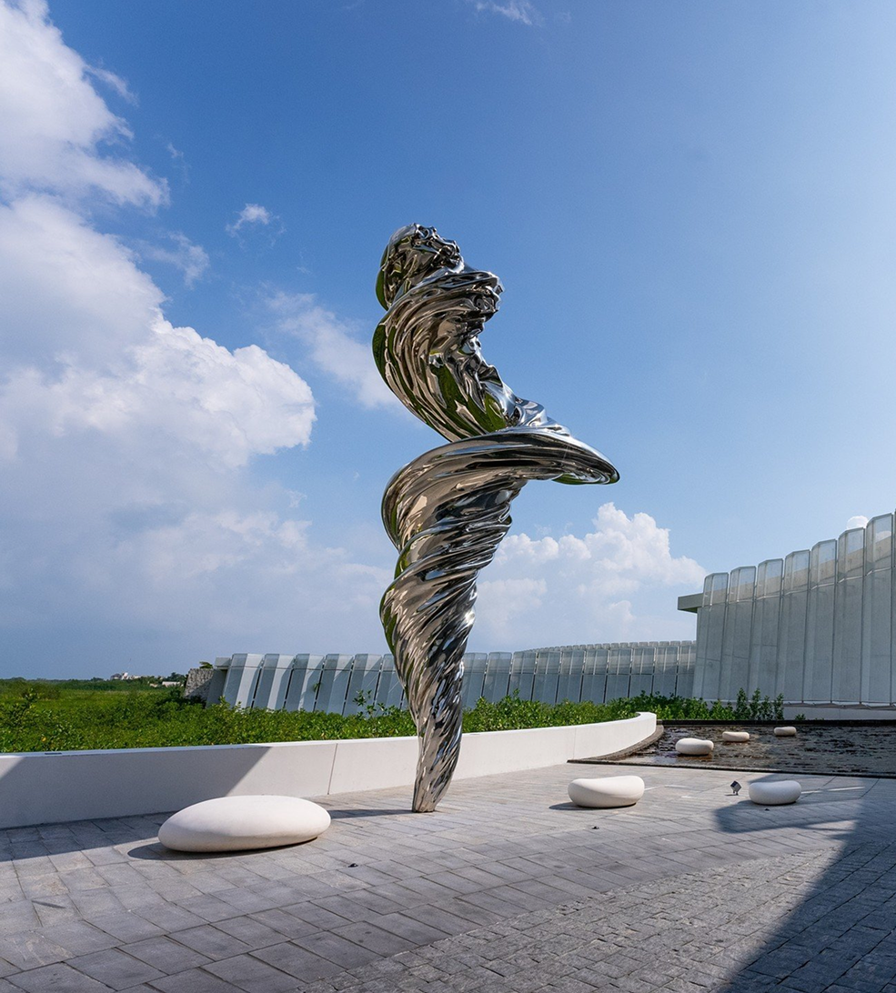 Installed in 2023, Spiral Vortex is a 7.5-meter mirror-polished stainless steel sculpture commissioned for the St. Regis Maya Resort in Cancún, Mexico — a site where sea, sky, and vegetation converge in radiant harmony. When I began Spiral Vortex, I was thinking about the energy of movement itself — how nature never really stands still. The spiral kept returning to me as a universal shape of transformation. You find it everywhere: in shells, whirlpools, galaxies, hurricanes — all these forms that express both creation and dissolution at once. I wanted to capture that tension — the feeling of being pulled inward while expanding outward. The mirror-polished surface lets the sculpture breathe with its surroundings. It’s constantly changing — reflecting clouds, light, and the lush greens of the Riviera Maya. For me, Spiral Vortex is about the continuity between the human and the natural — a moment where stillness, reflection, and movement all exist at once. It’s less a static object than a living presence — a kind of monument to the invisible forces that shape us and everything around us.
