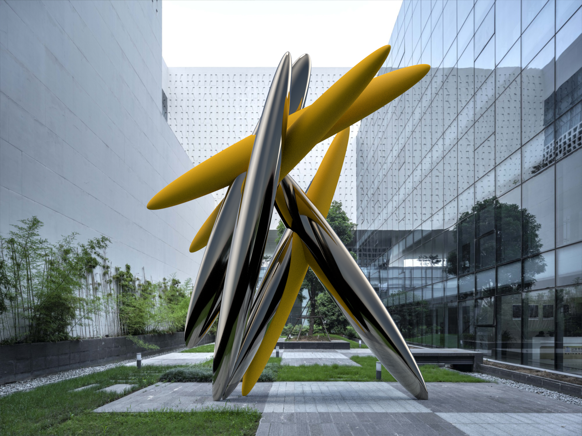 Installed in January 2020, my 7 meter tall stainless steel sculpture, Madrigal, is now part of a new sculpture park in Shuizhiyun City. The sculpture joins several other large scale pieces and is part of a public art initiative by the cultural advisory for the city. The sculpture projects and upward ascension toward the sky and draws the eye upward in a spiral toward the sun. The piece is fabricated in the highest quality stainless steel and finished in a double mirror polished finish.